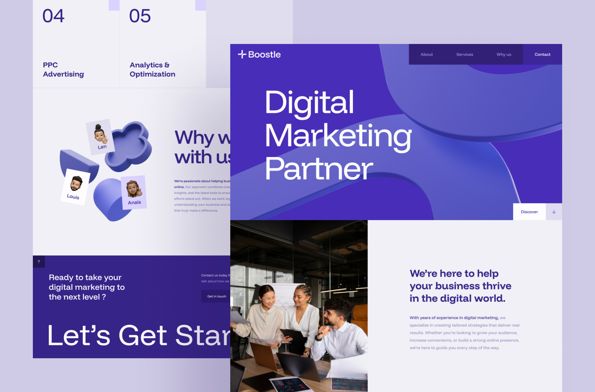 Personal project to create a fictitious digital marketing consulting company. Creation of a logo, 3D illustration modeling, conception and design of a website mock-up and fromscratch development of the site.